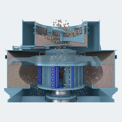 The VSI series vertical impact crusher optimizes product quality through multi-stage crushing. The material entering the crusher first enters the rotor and is accelerated to a speed of 45-70m/s. The material thrown out of the rotor collides with the material overflowing into the crushing chamber, achieving the purpose of material shaping and sand making. By adjusting the overflow flow rate, rotor speed, and rotor diameter, the throughput, aggregate shape, or sand grading can be controlled to meet various technical specifications.